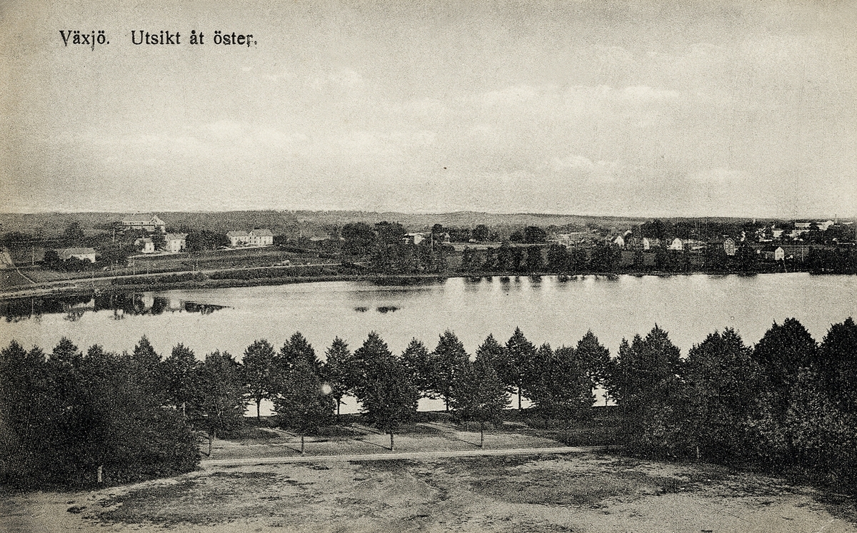 Vy mot Öster över Växjösjön, ca 1900. Fotot är taget från taket på Växjö högre allmänna läroverk, med skolgården i förgrunden. I övre högra hörnet skymtar dåv. Växjö hospital (S:t Sigfrid).