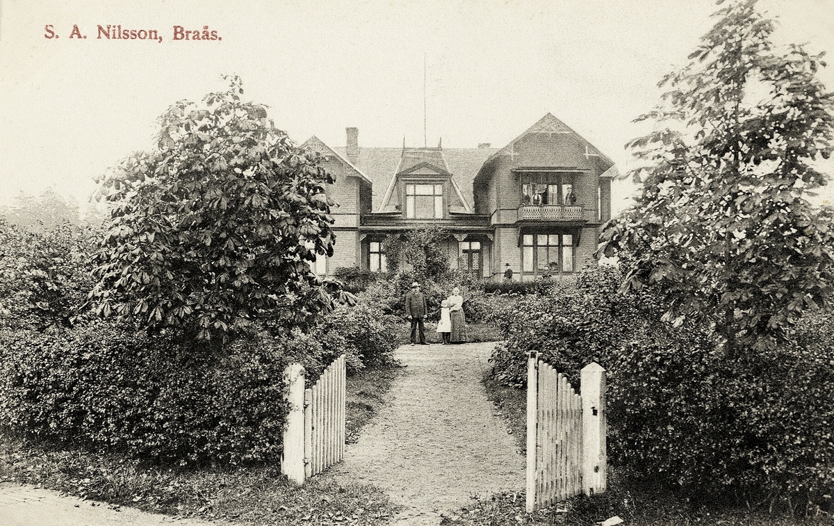 S.A. Nilsson, Braås. En större villa med trädgård, ca 1900. En man och en kvinna står framför huset med en liten flicka.