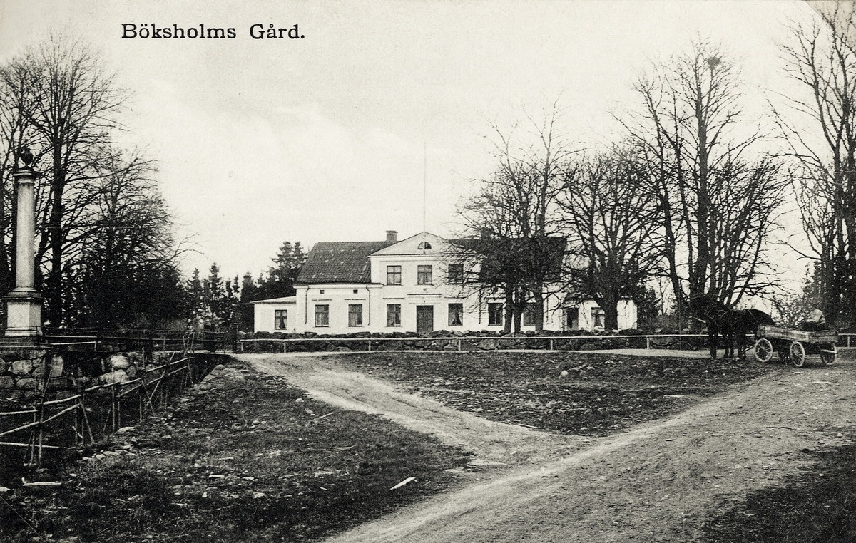 Böksholms herrgård, Drev, ca 1905. I trevägskorsningen står till vänster ett monument, en obelisk med urna. Den är uppförd 1854 av tacksamma arbetare. Inskriptionen lyder: Minne av en rättvis man god husbonde hofmarskalken riddaren af kongl.