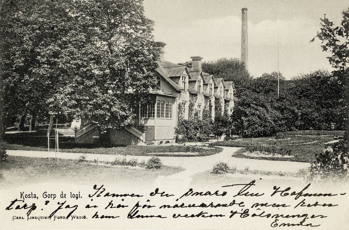 Herrgården/disponentbostaden, Kosta, 1904. I bakgrunden syns skorstenen på glasbruket.