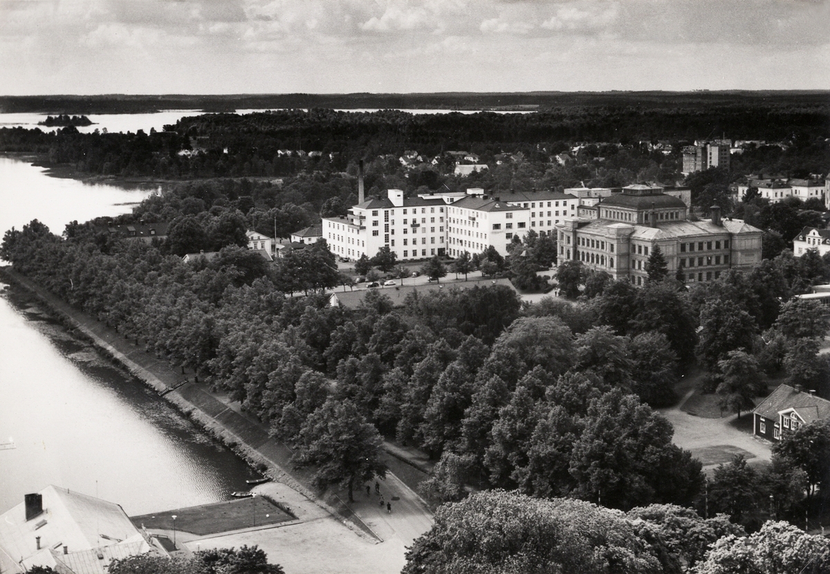 Foto från domkyrkotornet (?) mot sydväst, ca 1940-1945. Fr.v. ser man Växjö lasarett och Växjö högre allmänna läroverk. I nedre högra hörnet syns den då nyrestaurerade Domprostgården.