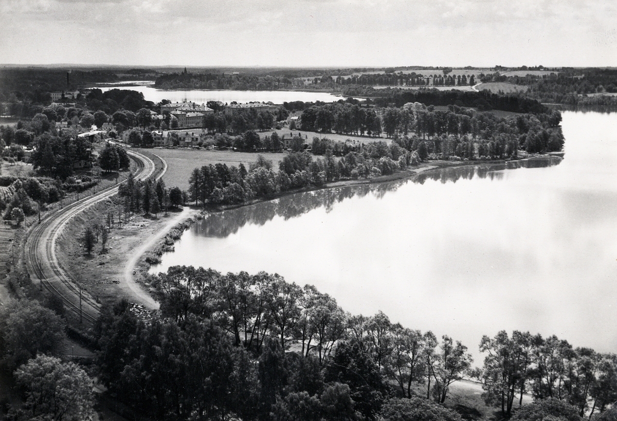 Vy över Växjösjön mot söder, ca 1940. I bakgrunden syns bl a S:t Sigfrids sjukhus och tornet på Teleborgs slott, på andra sidan Trummen.