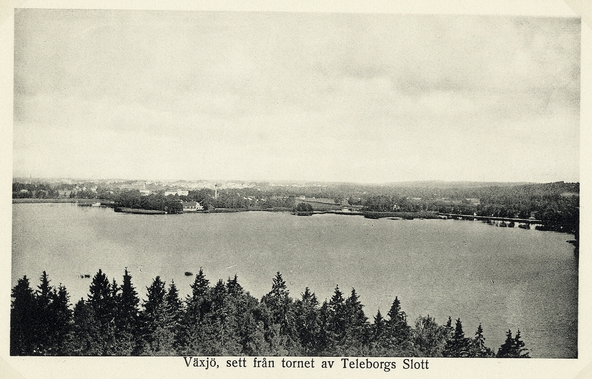 Utsikt mot Växjö, sett från tornet på Teleborgs slott, ca 1905, I förgrunden Trummen, följt av sjukhuskomplexet på S:t Sigfrid (då Växjö hospital).