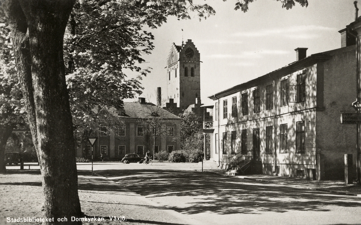 Dåv. stadsbiblioteket (numera Karolinerhuset) och domkyrkan i Växjö, ca 1940. Till höger syns hörnhuset i korsningen Skolgatan - Storgatan (kvarteret Djeknen).
