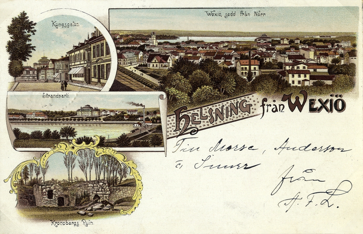 Färglitograferat vykort med flera småbilder från Växjö med omnejd, 1901.
