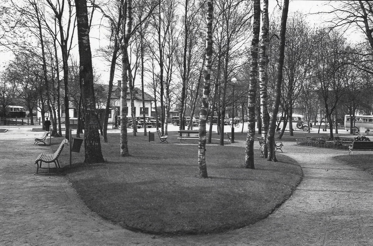 Järnvägsparken i Ljungby, 1938. Järnvägsstationen skymtar mellan träden.