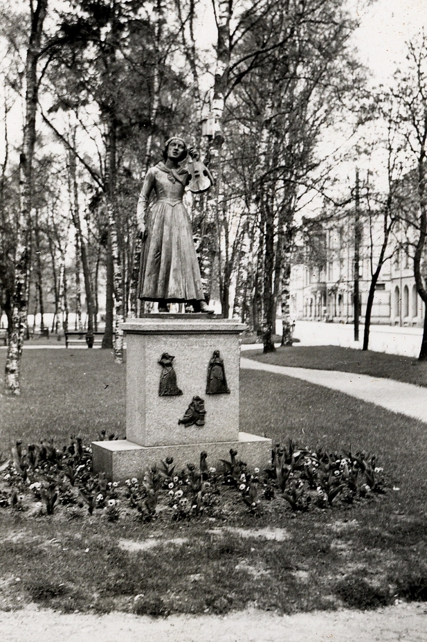 Järnvägsparken med Christina Nilsson-statyn, Ljungby,1946. I bakgrunden skymtar Storgatan.