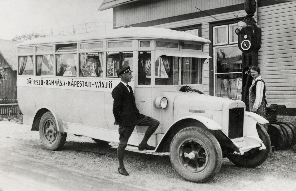 En buss har stannat för påfyllnad av bensin vid busslinjen Dädesjö - Växjö, ca 1925.