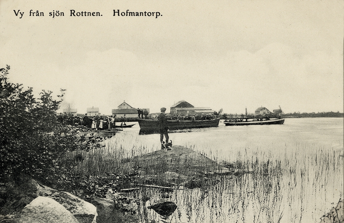 Vy över Rottnen, Hovmantorp, ca 1905. Två båtar fullastade med människor angör en "brygga" vid Hovmantorp.