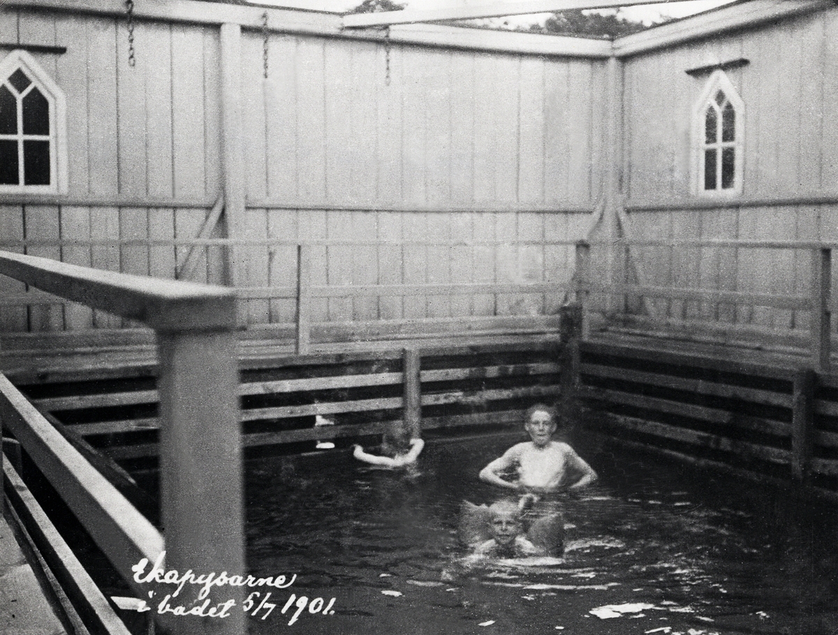"Ekapysarne" i badet, 5/7 1901. Pojkarna Bratt från Villa Eka leker i simbassängen tillsammans med en kamrat. Troligen kallbadhuset på Evedal.