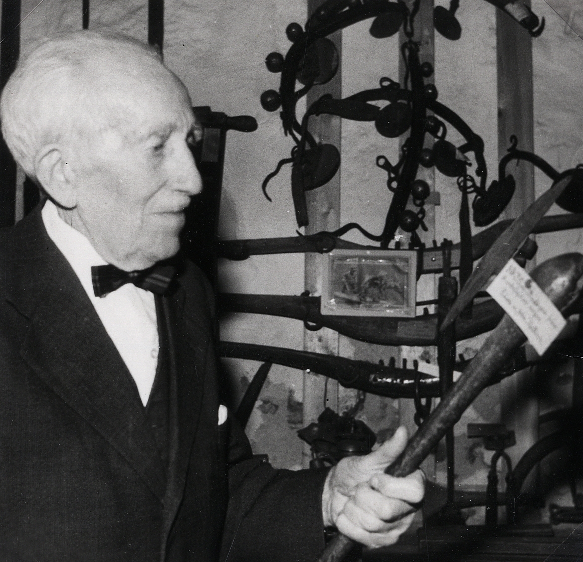 Kantor Erik Blank visar upp ett föremål. Lessebo, ca 1960.