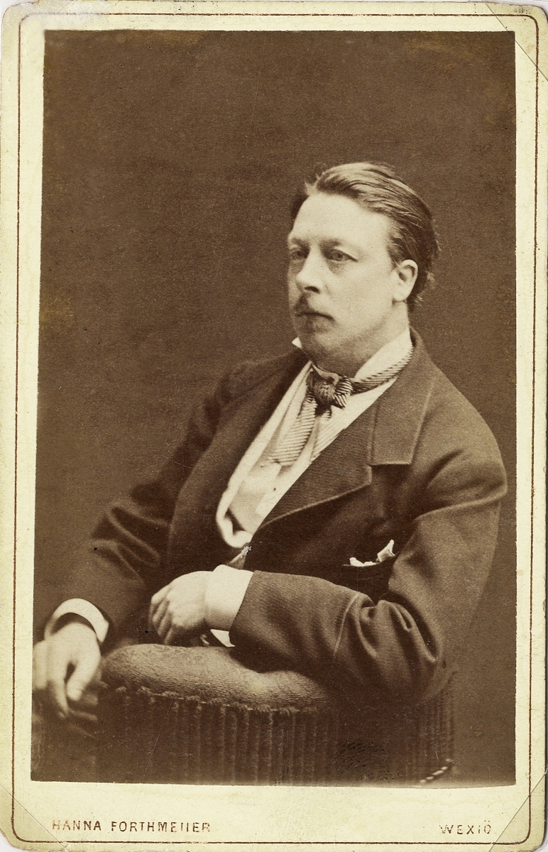 En man i mörk kostym med ljus väst, randig slips och stärkkrage lutar sig mot armstödet till en