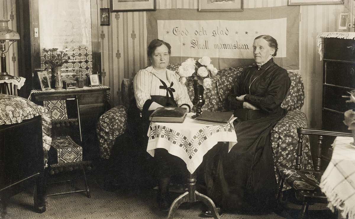 Två kvinnor sitter i en soffa i ett vardagsrum. Framför sig har de ett pelarbord med några fotoalbum.