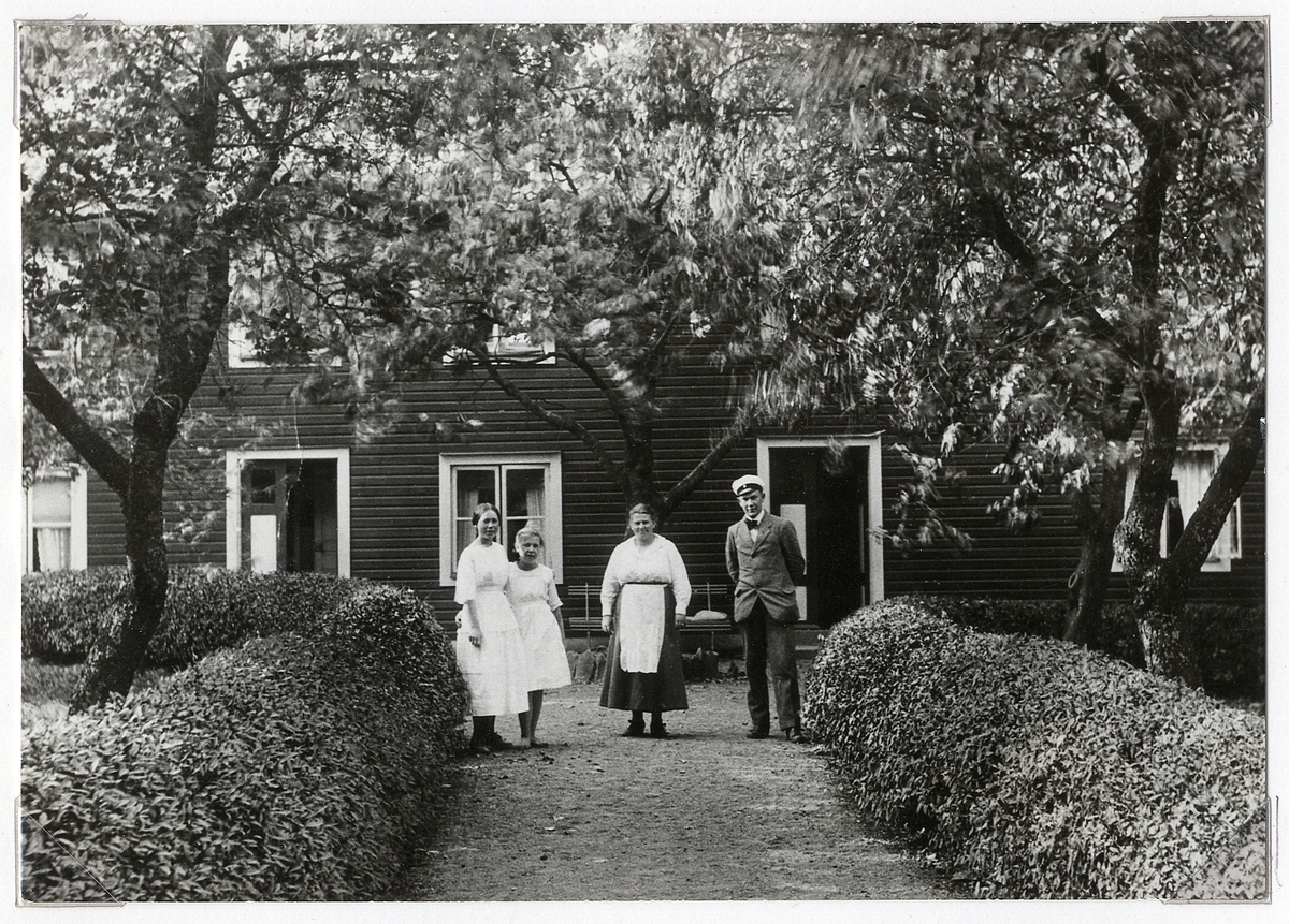 I trädgården syns bl a sonen kanslist Josef Petersson, fru Tilda Christina Petersson och fru Ellen Lund.