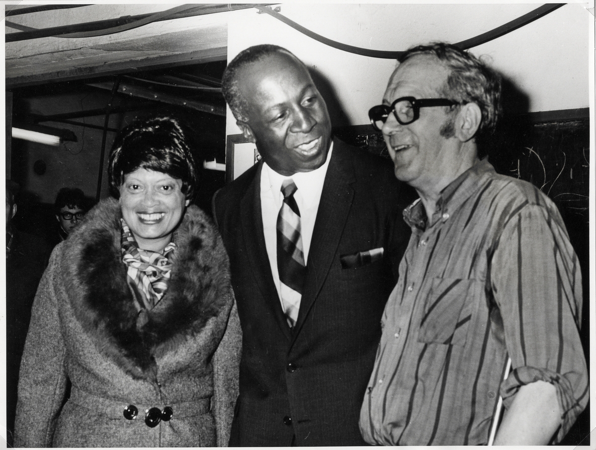 Glasblåsarmästare Bengt Heintze samtalar med amerikanske ambassadören Jerome Holland med fru vid ett besök på Kosta