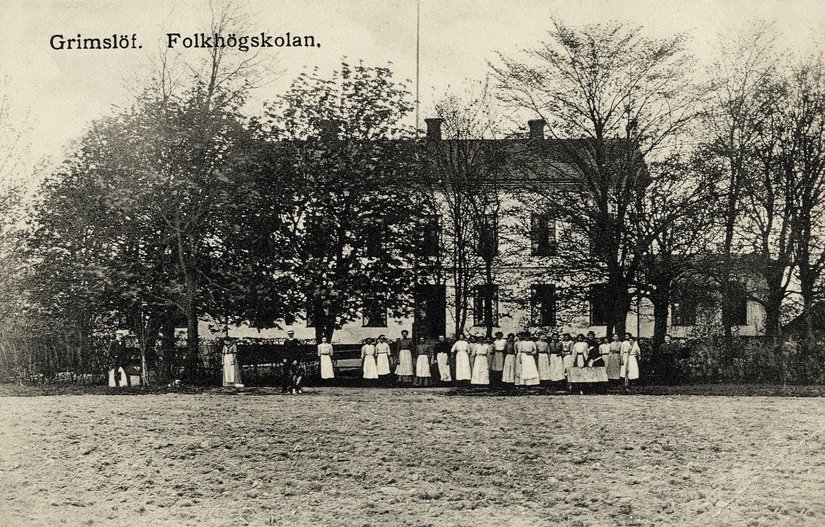 Grimslövs folkhögskola, ca 1910. En grupp människor står framför skolbyggnaden.