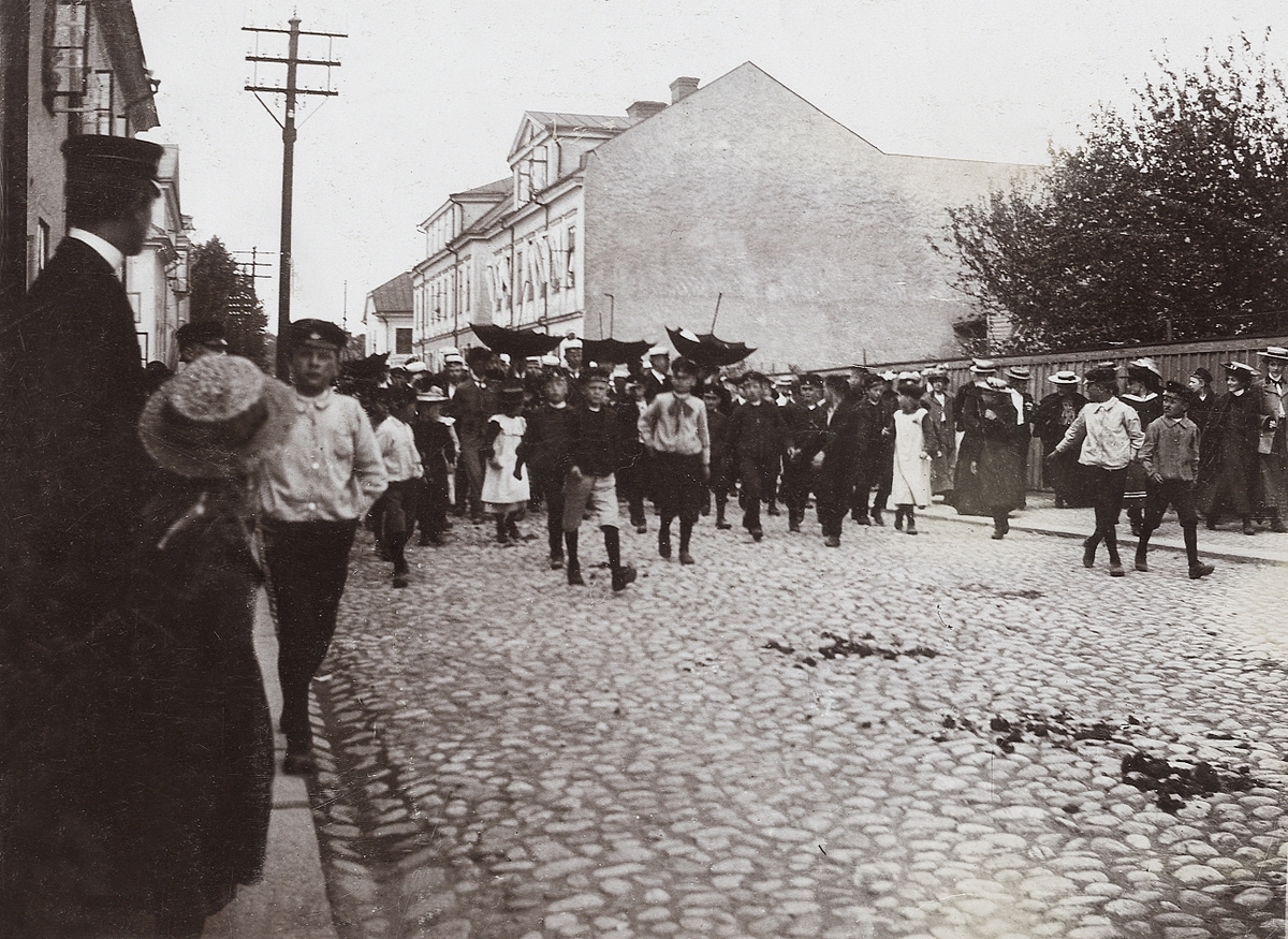 Studentupptåg i Växjö, ca 1910. De nybakade studenterna är på väg längs Västergatan mot mössmakare Lindahl på Västergatan 1, med upp-och-ner vända paraplyer.