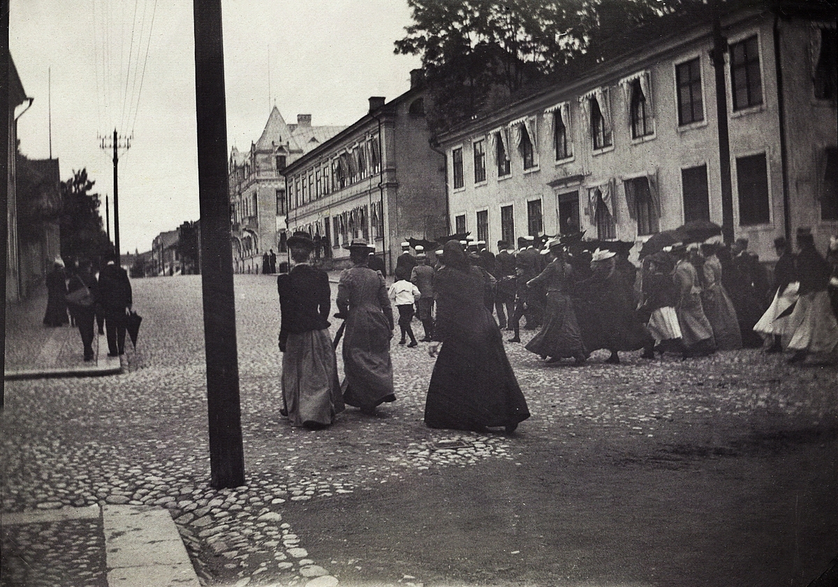 Studenter på marsch längs Kronobergsgatan norrut, tätt följda av nyfikna. Till höger ser man husen i kvarteren Kristina och Lejonet med apotekshuset, Kronobergsgatan 6.