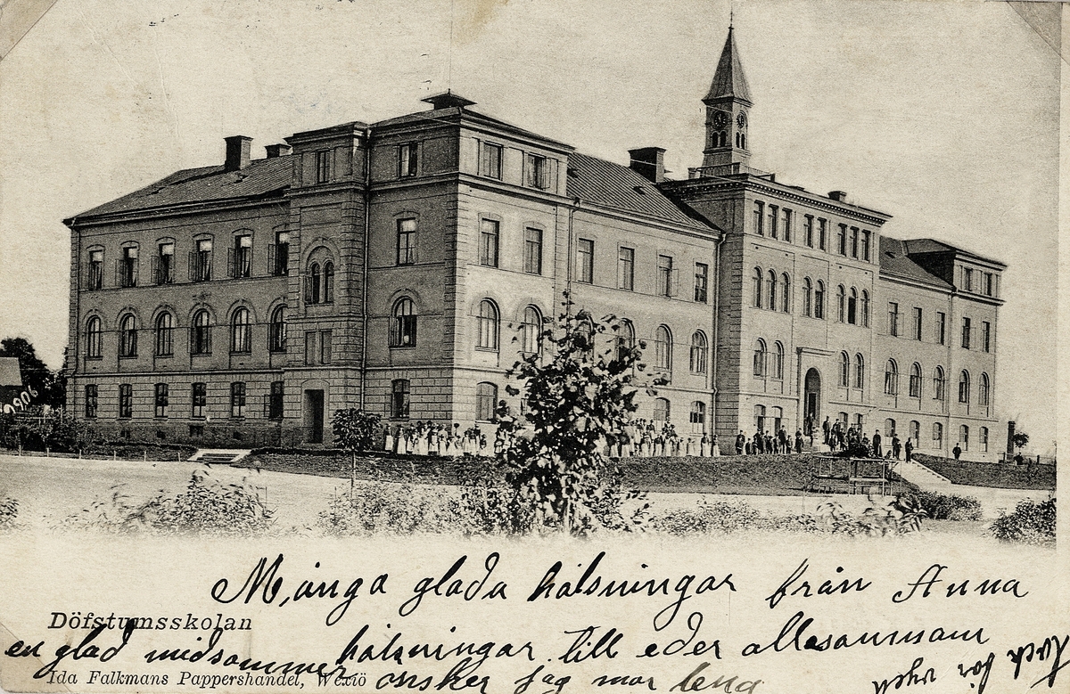Dövstumskolan, Växjö, ca 1905. Vid byggnaden står elever och personal uppställda.