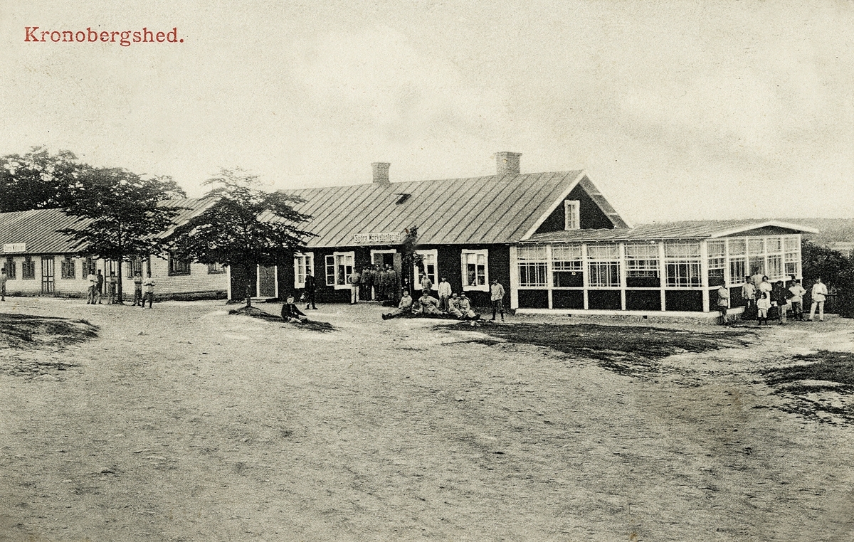 Kronobergshed, Lekaryd, 1910. Det s.k. Södra Marketenteriet. Grupper av soldater har samlats utanför huset.