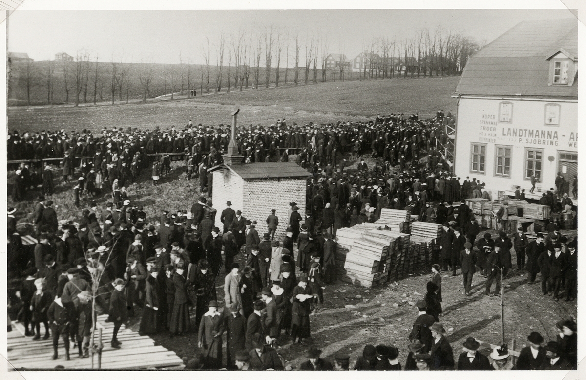 Folk i staden fick inte tag i livsmedel. Handlande Per Sjöbring, innehavare av "Landtmanna-affären", misstänktes leverera livsmedel till utlandet. I bakgrunden syns allén upp till Östrabo.