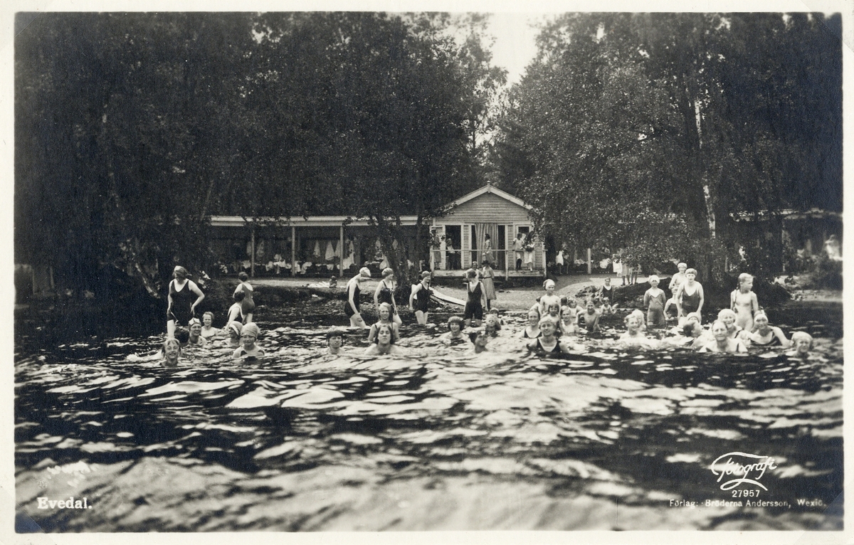 Evedals badplats, ca 1930. Ett antal kvinnor och barn badar vid den nyanlagda badplatsen.