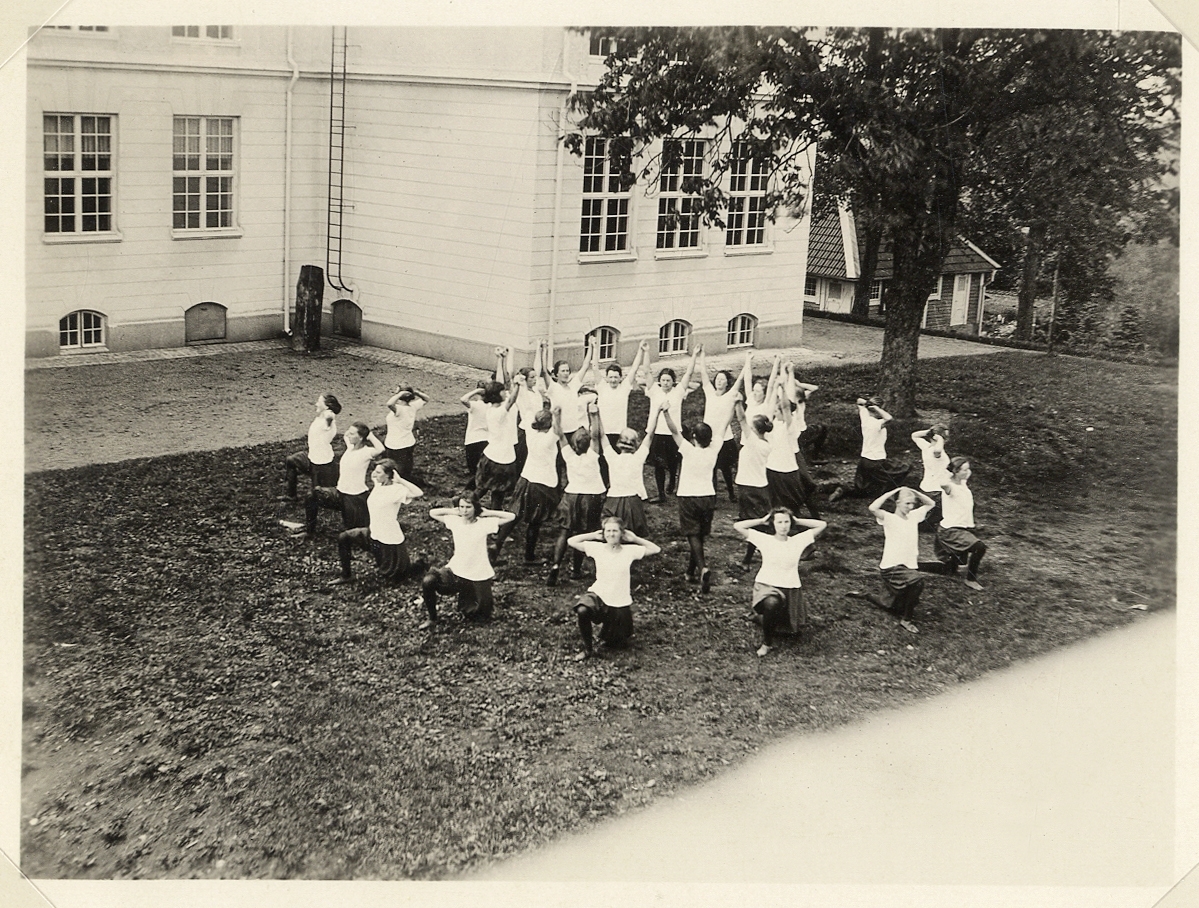 En grupp kvinnliga elever på folkskollärarseminariet (Ringsbergsskolan) i Växjö har gymnastik bakom skolan. Ca 1914.