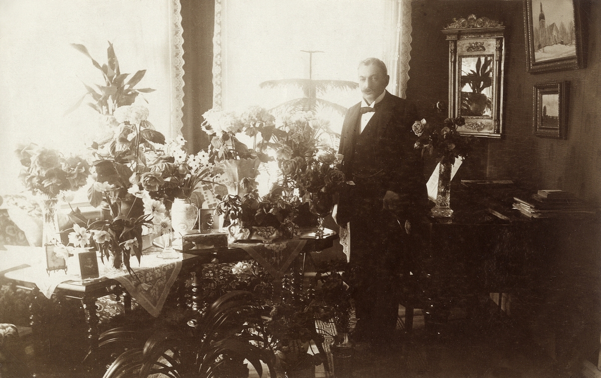 Landsfiskal Gustaf Herrlin, Åseda, poserar i sitt vardagsrum på 50-årsdagen, 24 april 1919.