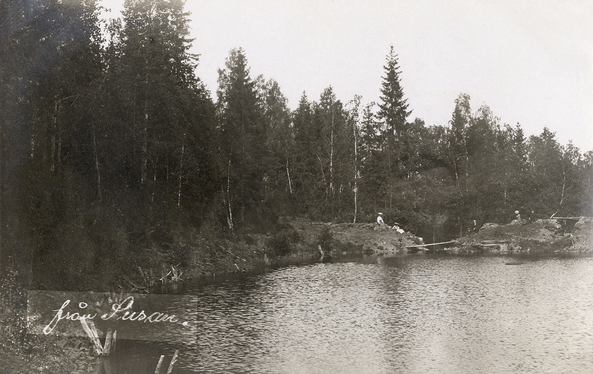 Några personer på utflykt sitter på några klippor vid en sjö. Ca 1905.