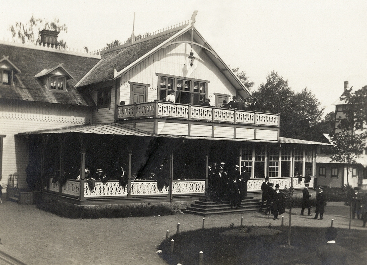 Restaurangen på Evedals hälsobrunn från parksidan, ca 1910. Till höger skymtar dåv. badhuset.