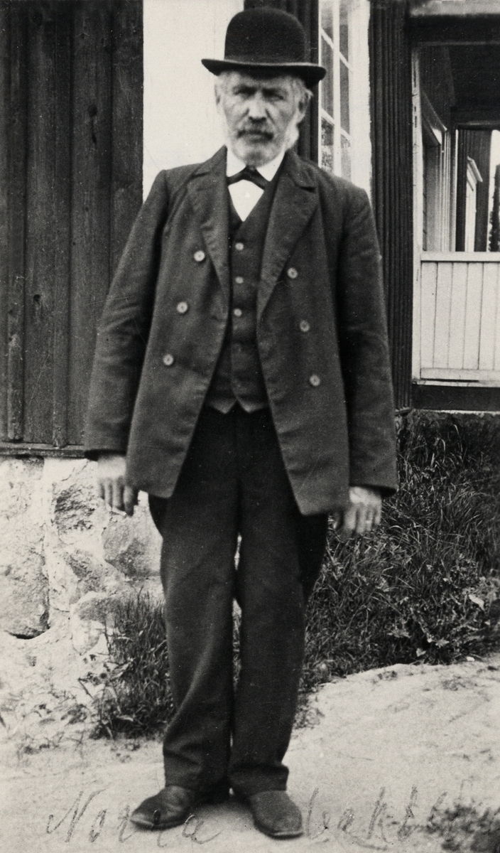 En skomakare, bosatt i Norra Vaktstugan på Gamla Norr i Växjö, poserar för fotografen, ca 1920.