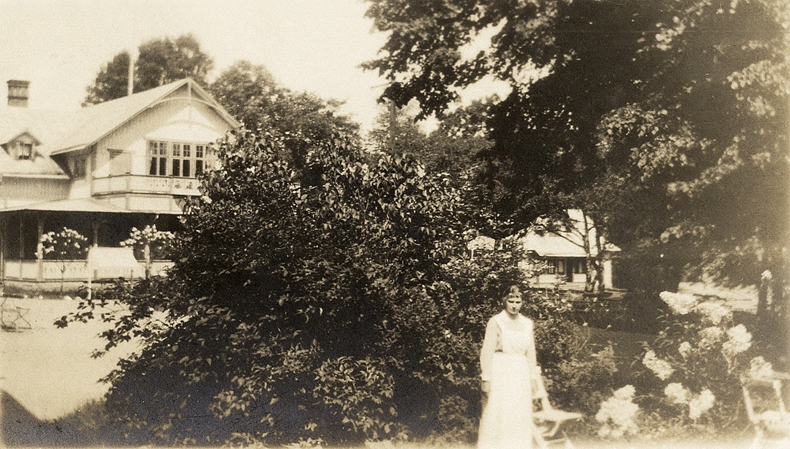 Evedal, Växjö, ca 1920. En kvinna i klänning och förkläde står i förgrunden, med restaurangen bakom sig.