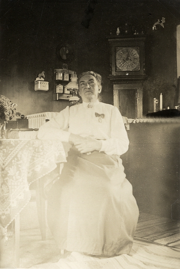 En medelålders kvinna, Lovisa Kullberg ("Lovisa te Boismans"), med förtjänstmedalj på bröstet, sitter vid ett köksbord, troligen i Boismanska gården, Växjö, ca 1915.