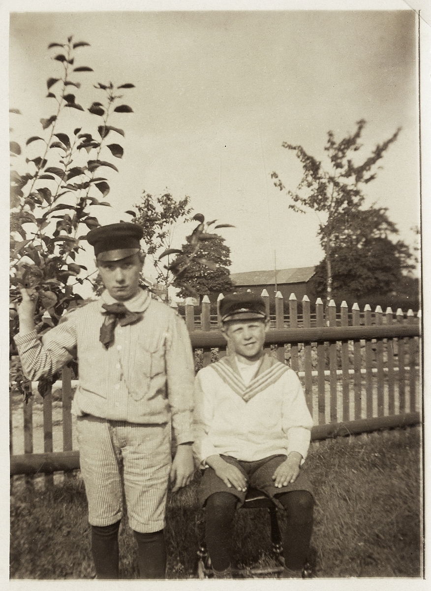 Två pojkar klädda i sjömansdräkt i en trädgård. Ca 1900.