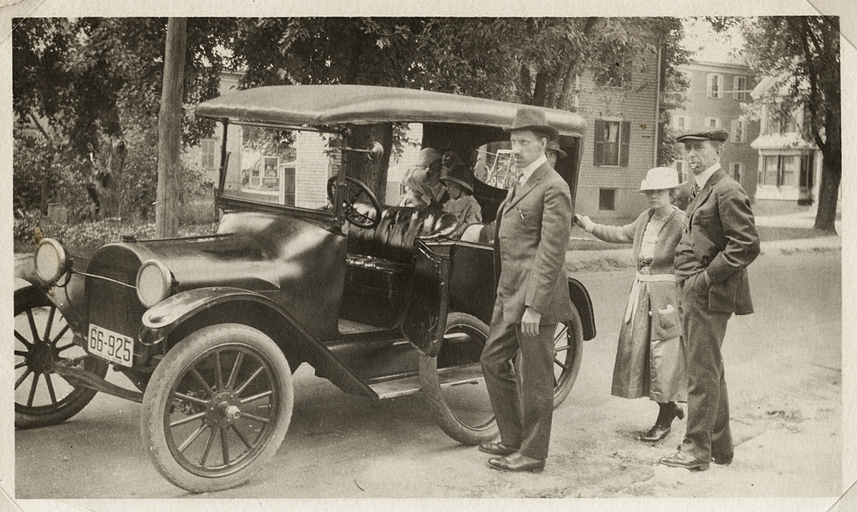 På långtur. Två män och en kvinna poserar utanför en bil (efter däckbyte?). I bakgrunden syns några bostadshus.