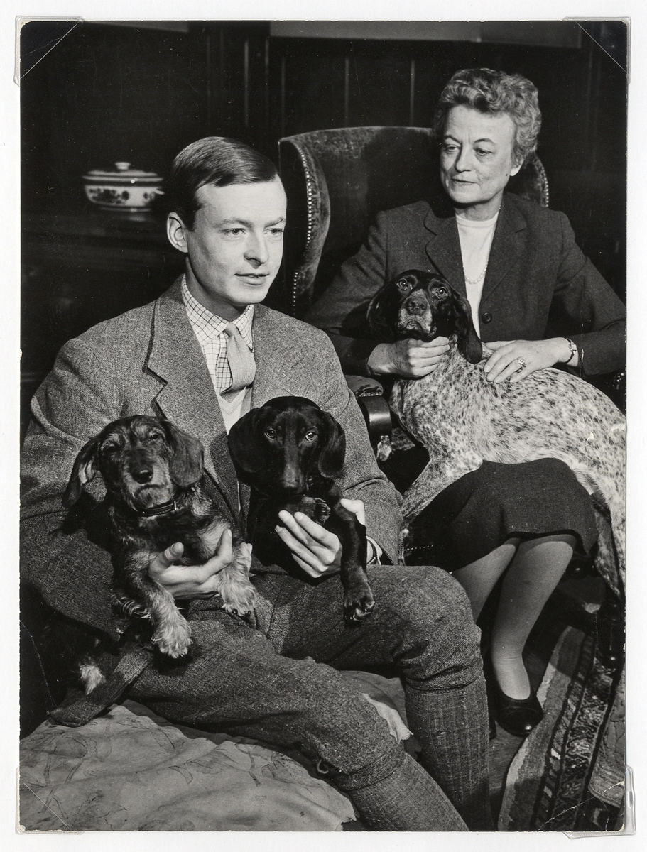 Friherre Niclas Silfverschiöld, Koberg, med sin mor Madeleine och några hundar, 1964.