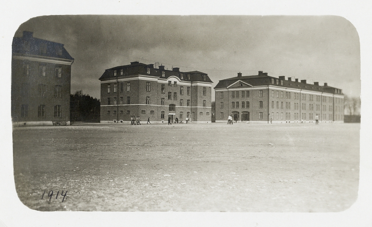Vy över ett nybyggt (?) regemente en vintrig dag, 1914.