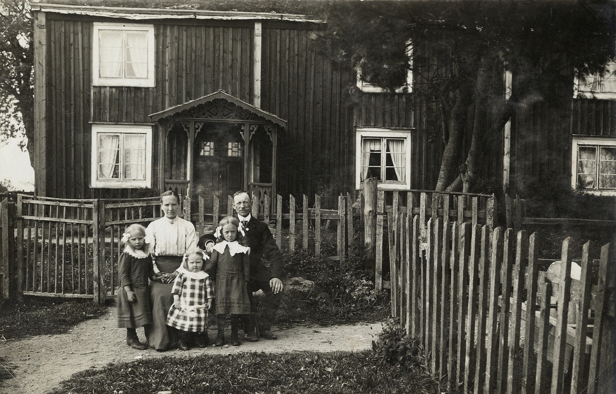En familj är avfotograferade framför sitt hus, någonstans i länet.
