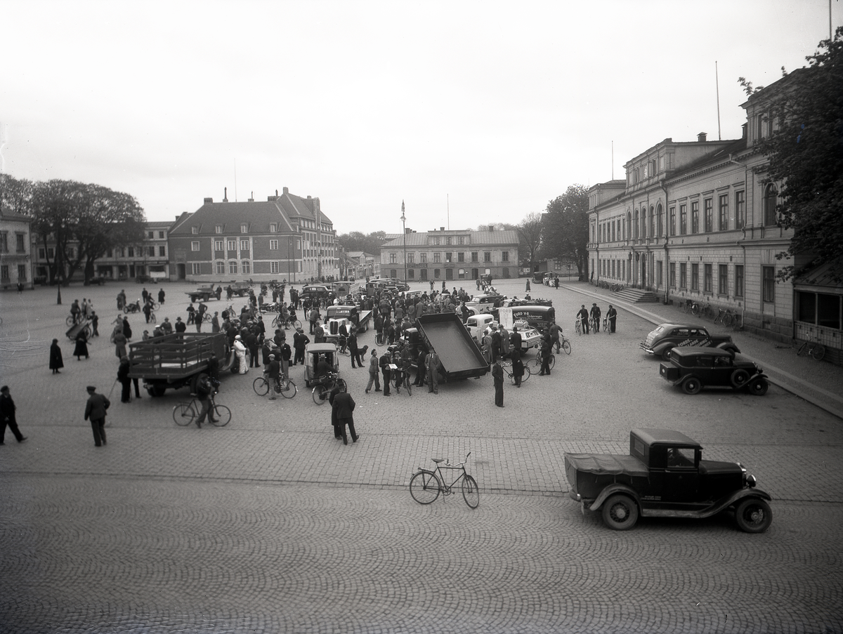Förberedelse för bilutställning på Stortorget i Växjö, 1931 eller 1937.