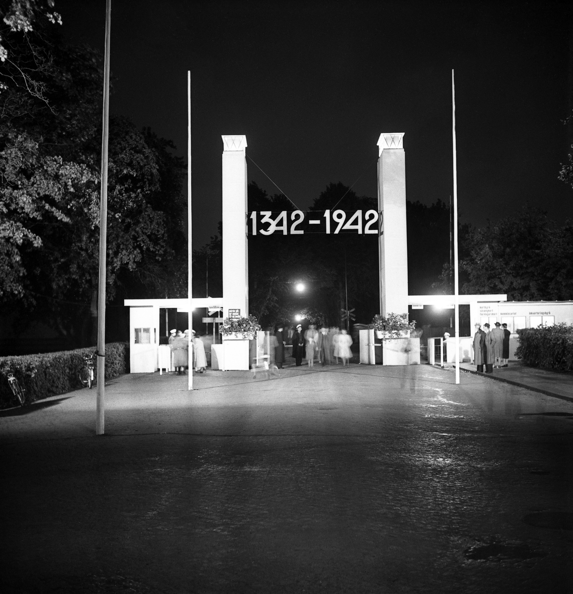 Köpmännens dag. Kvällsbild från huvudentrén till jubileumsutställningen.