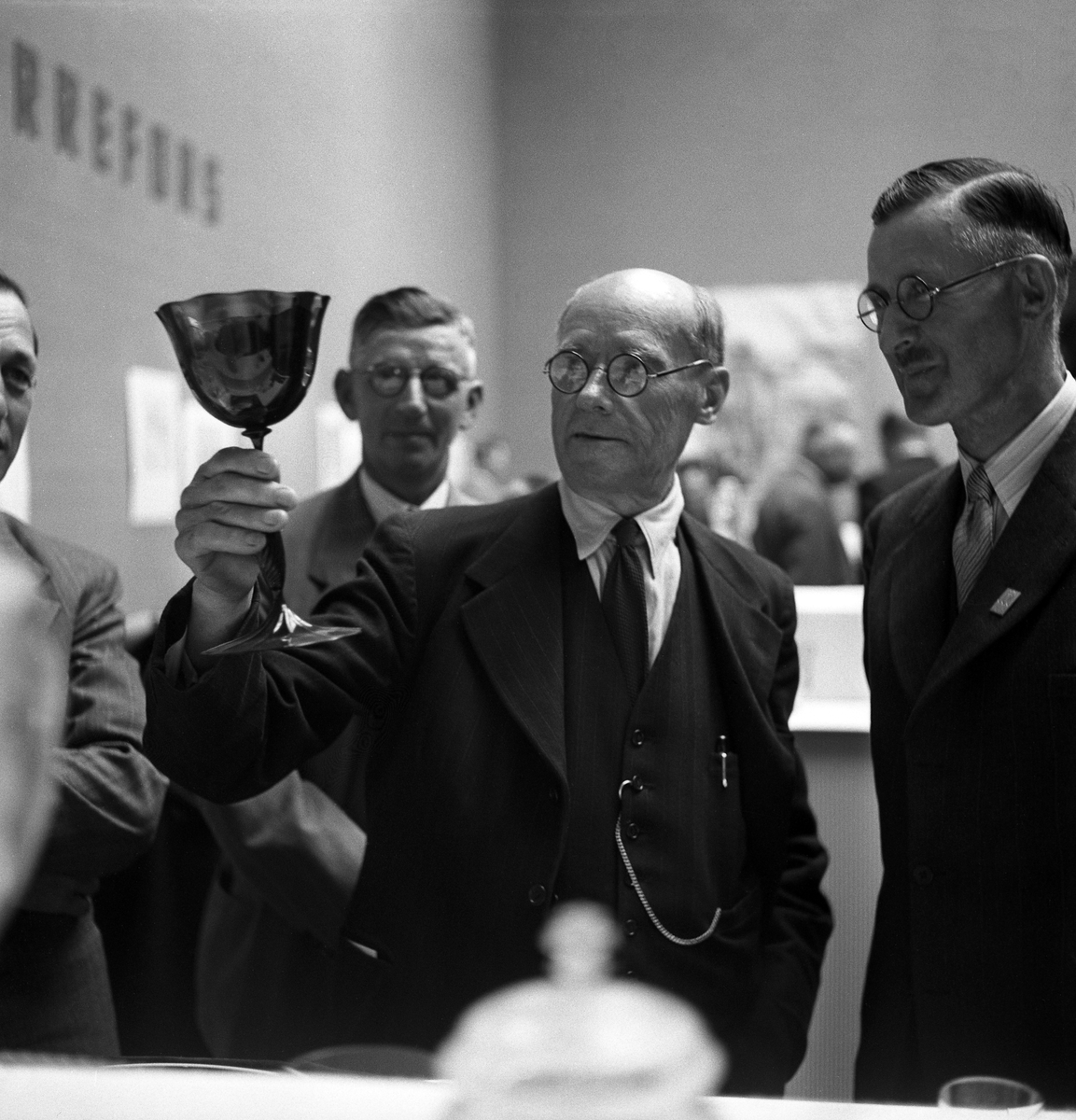 Glasets dag. Smålands Museum. Knut Bergqvist m.fl. studerar ett s.k. slottsglas från Orrefors.