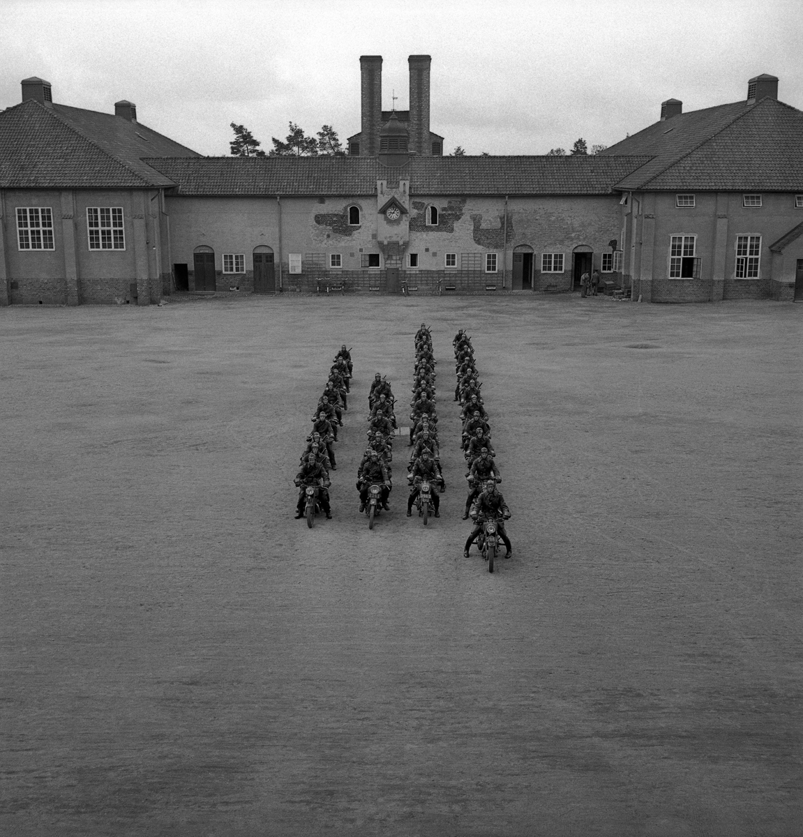 Ett antal män med motorcyklar står uppställda på kaserngården, I 11, Växjö.