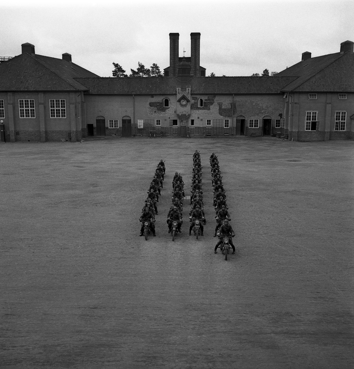 Ett antal män med motorcyklar står uppställda på kaserngården, I 11, Växjö.