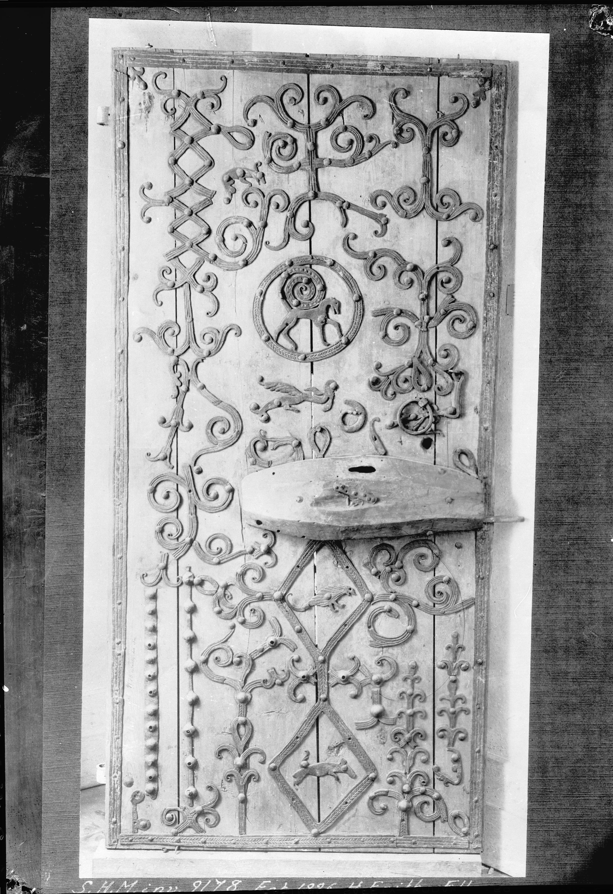 Trädörr med järnbeslag.