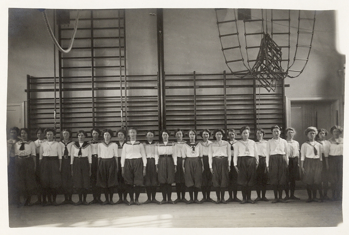 En grupp kvinnliga elever i gymnastiksalen på folkskollärarseminariet (Ringsbergsskolan), Växjö ca 1914.