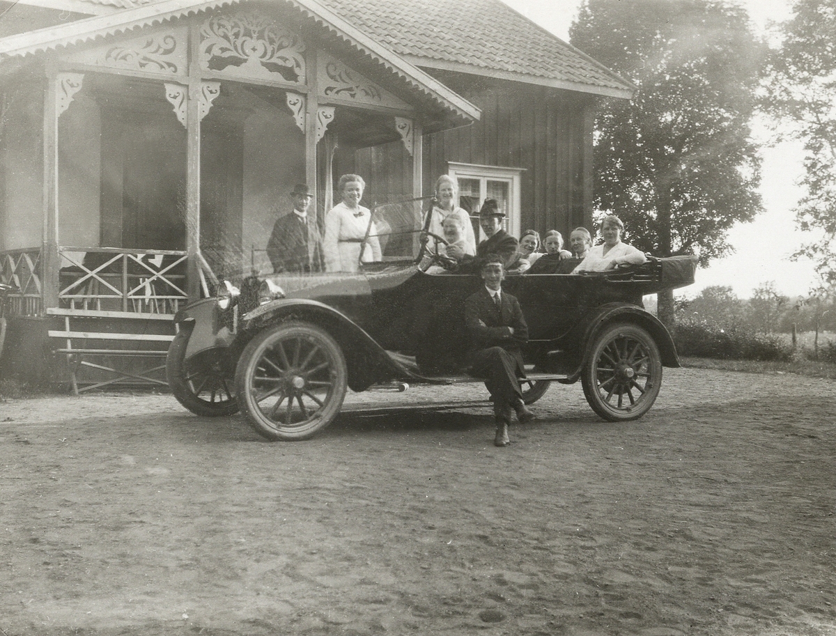 Gustav Sjögren med bil, av märket Dodge modell 30 från ca 1920, och passagerare framför överlärare Frans Berggrens sommarhus. Urshult, ca 1920.