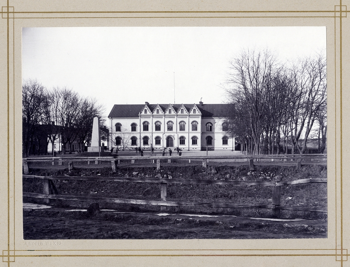 Framför byggnaden (till vänster) syns monumentet över domprosten Håkan Sjögren (1727-1815), Växjö.