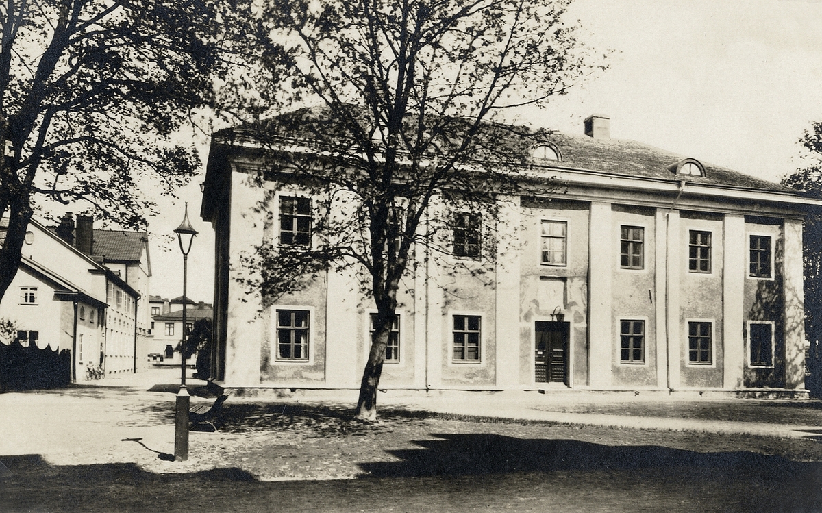 Gamla gymnasiet (Karolinerhuset), Växjö, 1930-tal. Till vänster ser man några av Smålandspostens byggnader.