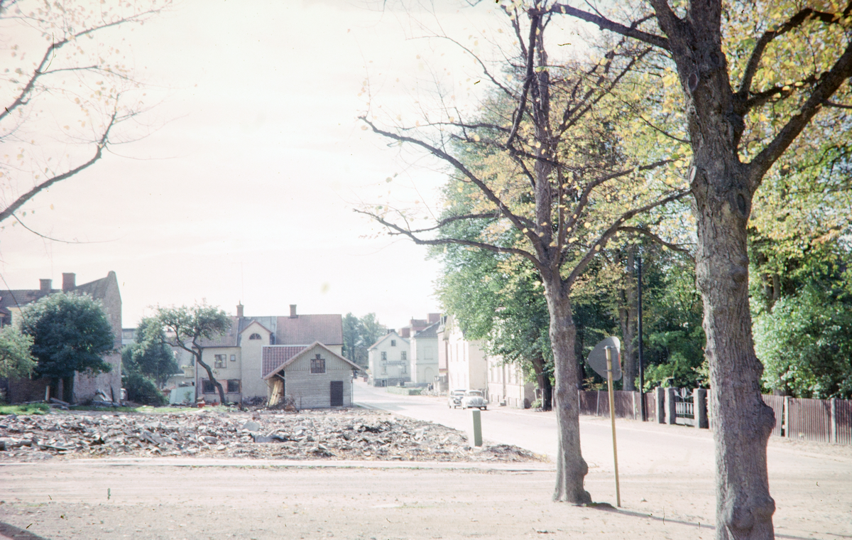 Korsningen Norra Esplanaden/Västergatan (kv. Hörnet och Ansgarius), Växjö. En rivningstomt syns i förgrunden.