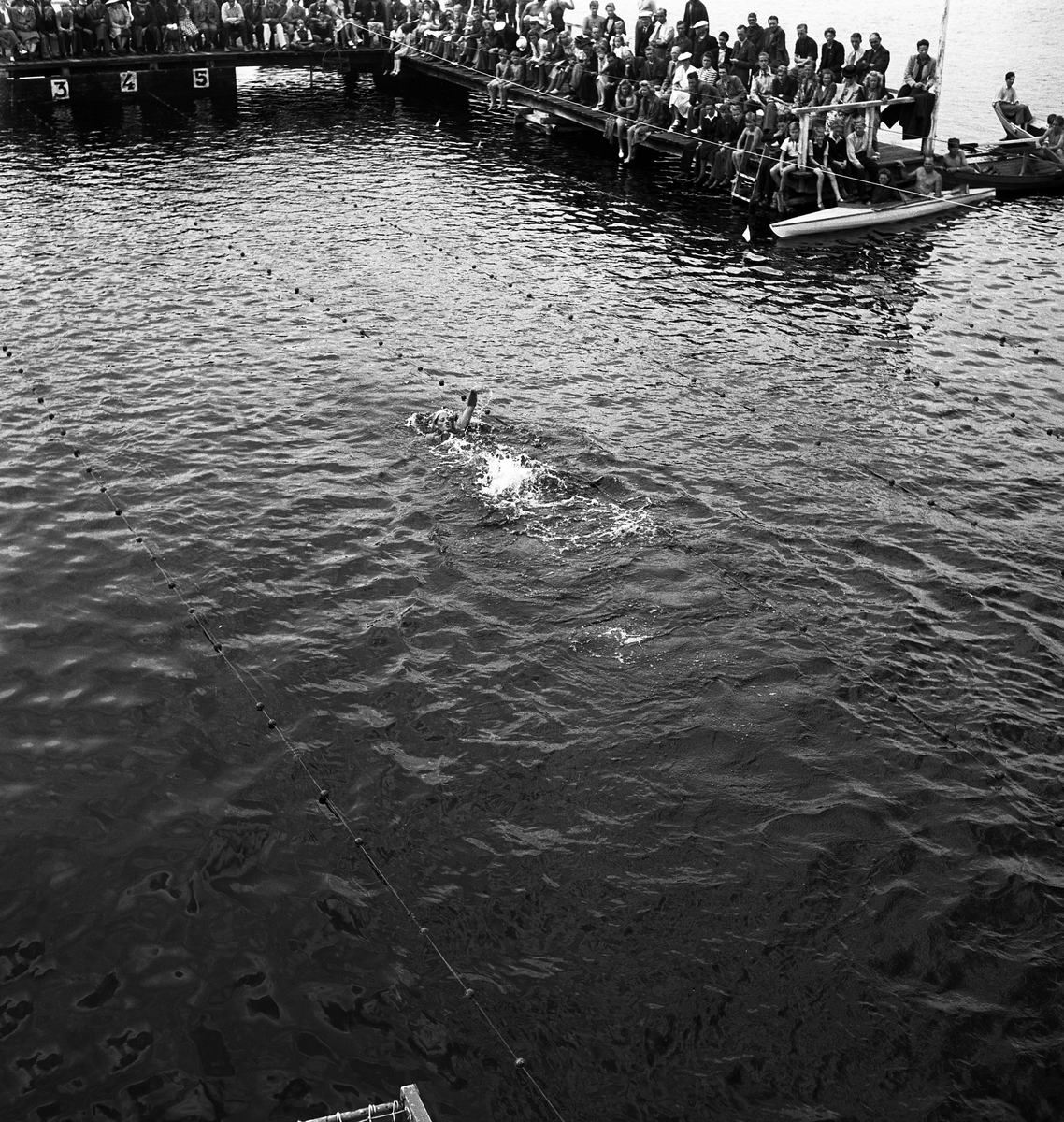 Simningen. Vy över tävlingsbassängen på Evedal. En simmerska syns i